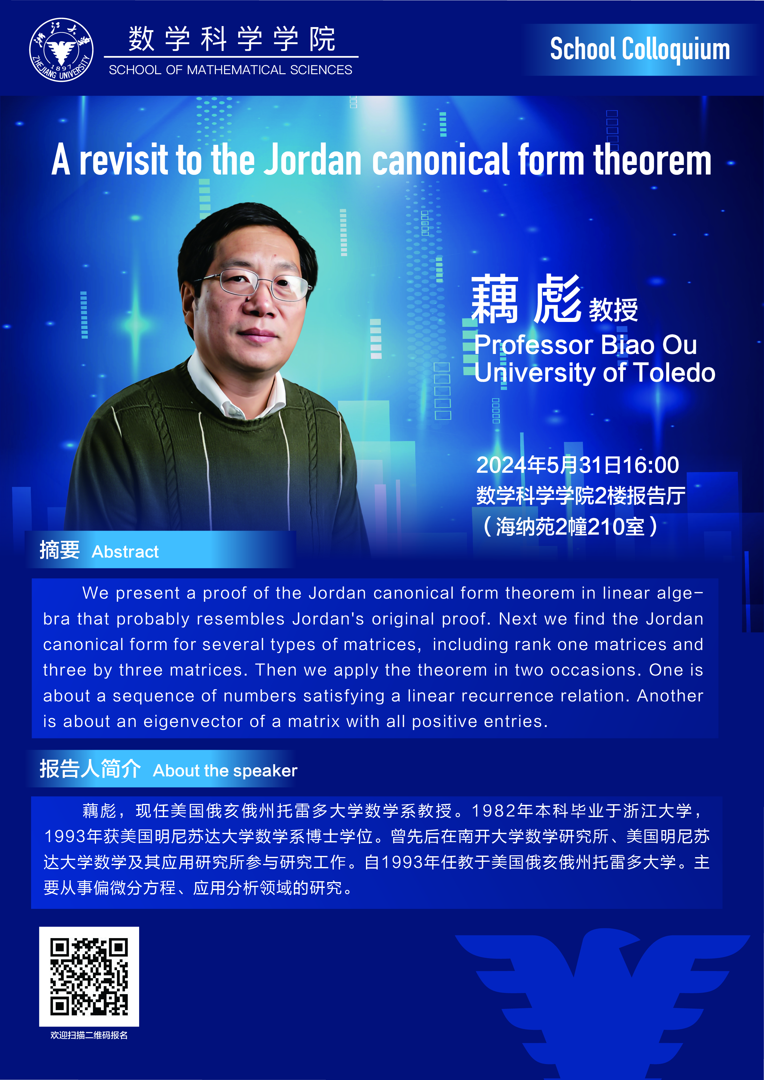 School Colloquium——A revisit to the Jordan canonical form theorem